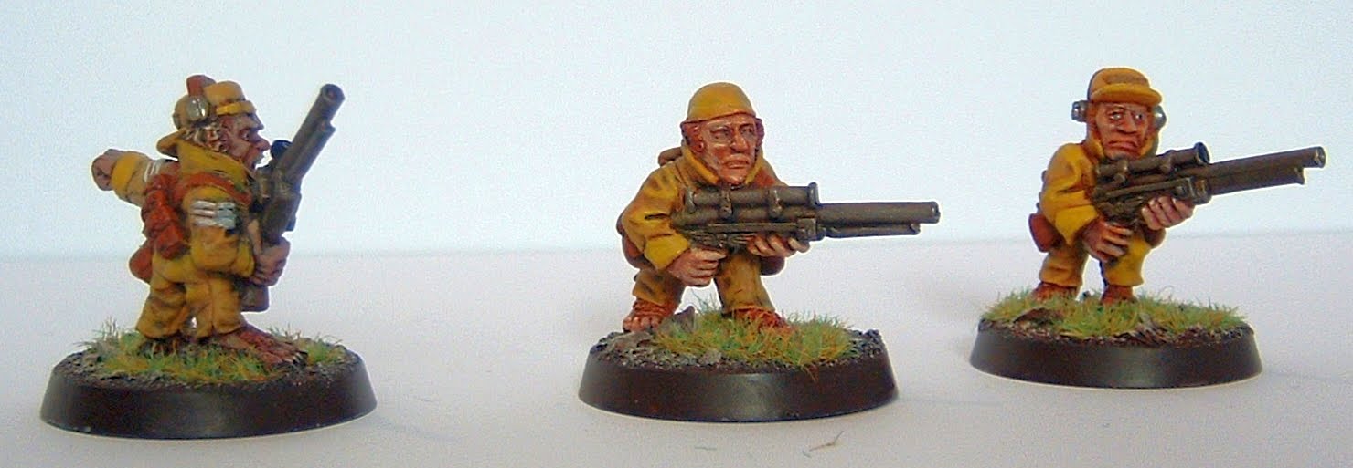 I am quite pleased they way these minis have turned out so far as they were created from the bits box. The heads were catachian or warhammer militia, the torsos cadian, catachian or warhammer militia and the legs were mainly cadian with 3 conversions. The poses are supposed to be characterful. The eyes have been deliberately left white to show the desperation and berserker madness of these troopers forced through the explosive collars to redeem themselves by their own inescapable mortality on the battle field.